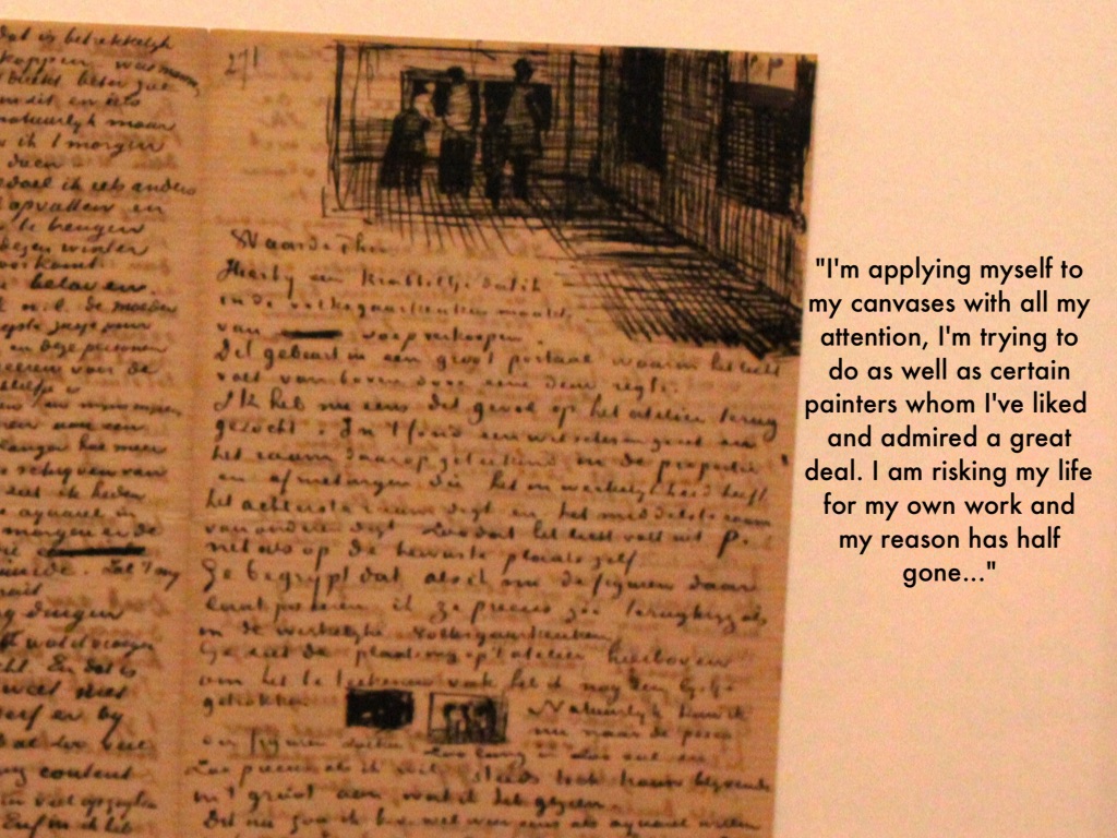 "I'm applying myself to my canvases with all my attention, I'm trying to do as well as certain painters whom I've liked and admired a great deal. I am risking my life for my own work and my reason has half gone..."
