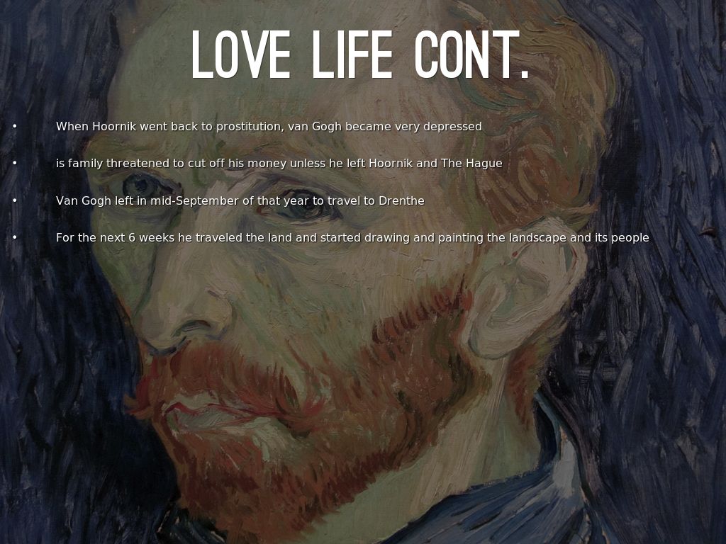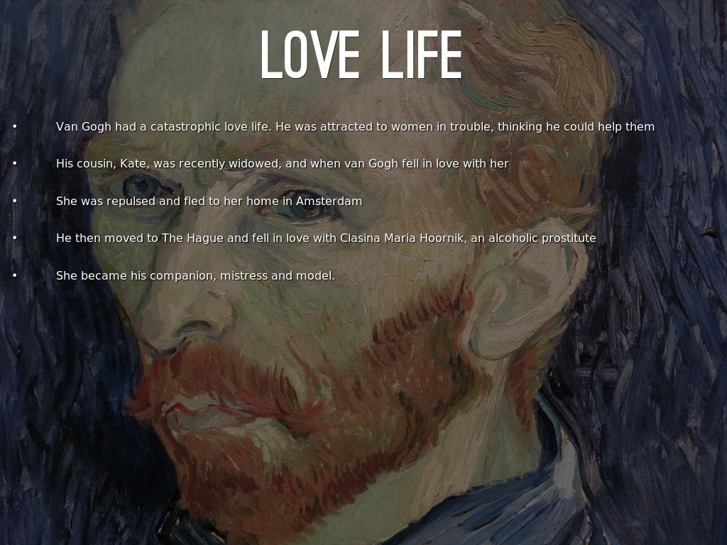 Van Gogh had a catastrophic love life. He was attracted to women in trouble, thinking he could help them