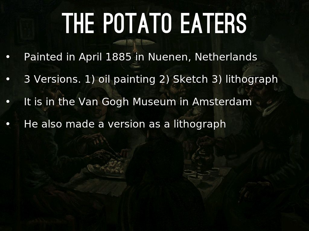 In 1885, he began work on what is considered to be his first masterpiece, "Potato Eaters."