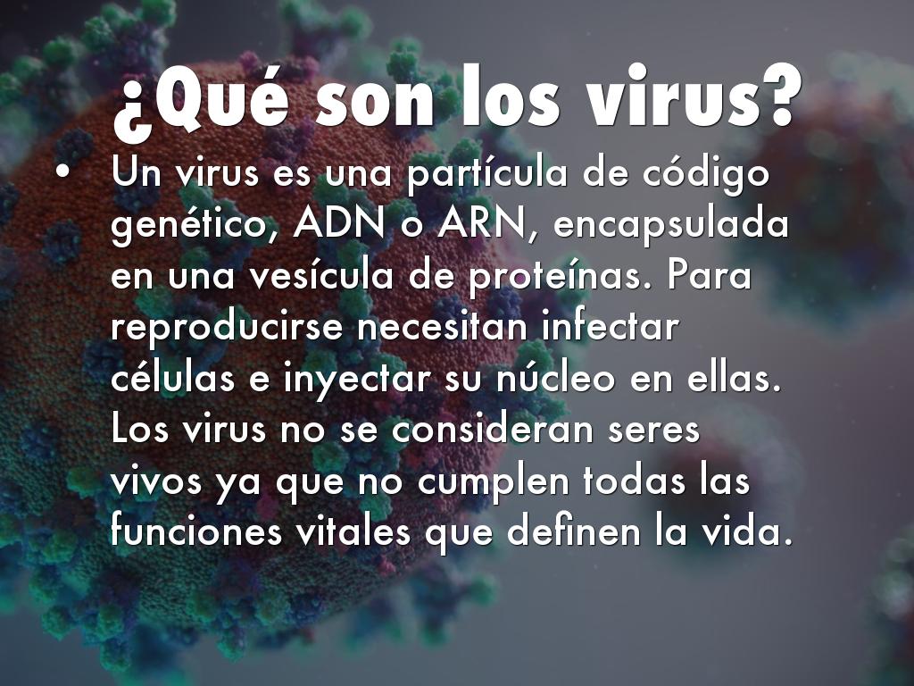 Un virus es una partícula de código genético, ADN o ARN, encapsulada en una vesícula de proteínas. Para reproducirse necesitan infectar células e inyectar su núcleo en ellas. Los virus no se consideran seres vivos ya que no cumplen todas las funciones vitales que definen la vida.