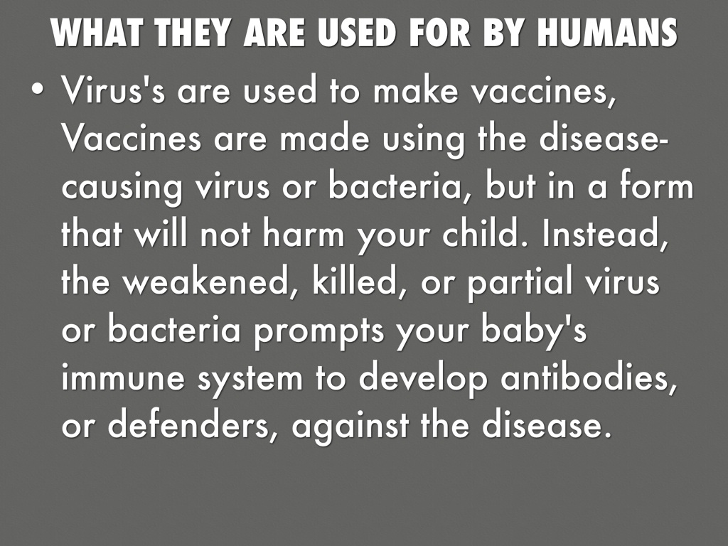 Virus's are used to make vaccines, Vaccines are made using the disease-causing virus or bacteria, but in a form that will not harm your child. Instead, the weakened, killed, or partial virus or bacteria prompts your baby's immune system to develop antibodies, or defenders, against the disease.