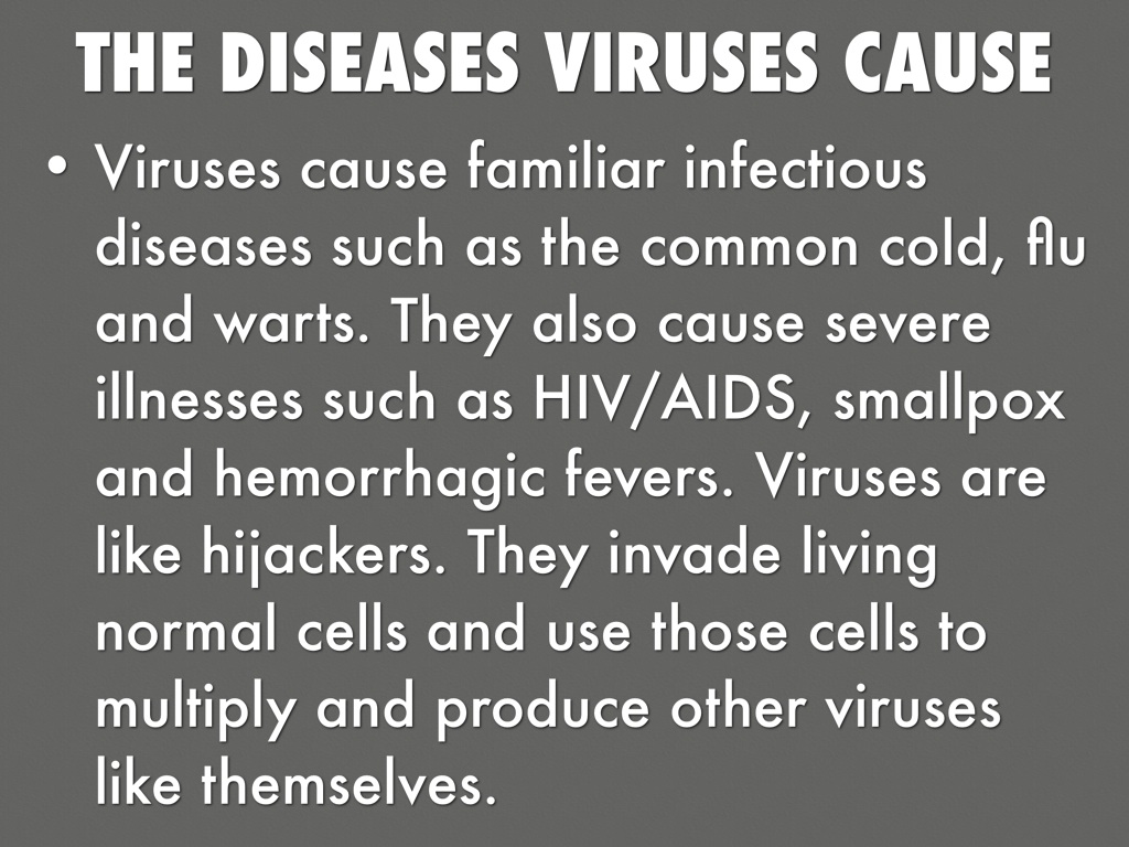 Viruses cause familiar infectious diseases such as the common cold, flu and warts. They also cause severe illnesses such as HIV/AIDS, smallpox and hemorrhagic fevers. Viruses are like hijackers. They invade living normal cells and use those cells to multiply and produce other viruses like themselves.