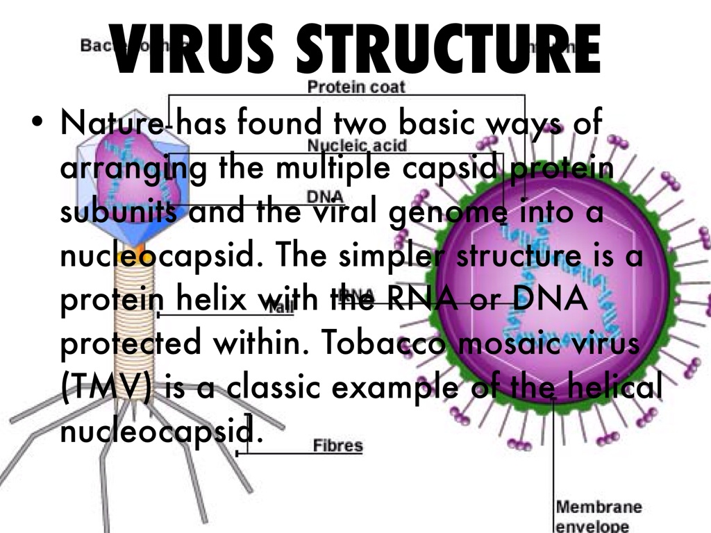 Nature has found two basic ways of arranging the multiple capsid protein subunits and the viral genome into a nucleocapsid. The simpler structure is a protein helix with the RNA or DNA protected within. Tobacco mosaic virus (TMV) is a classic example of the helical nucleocapsid.