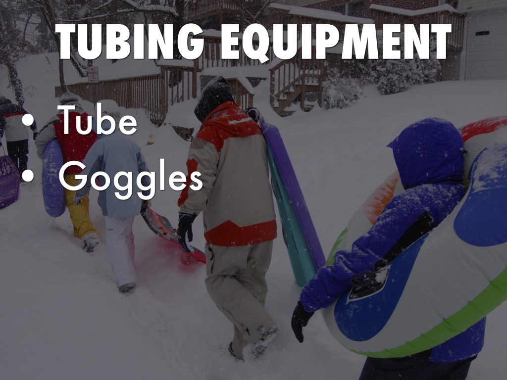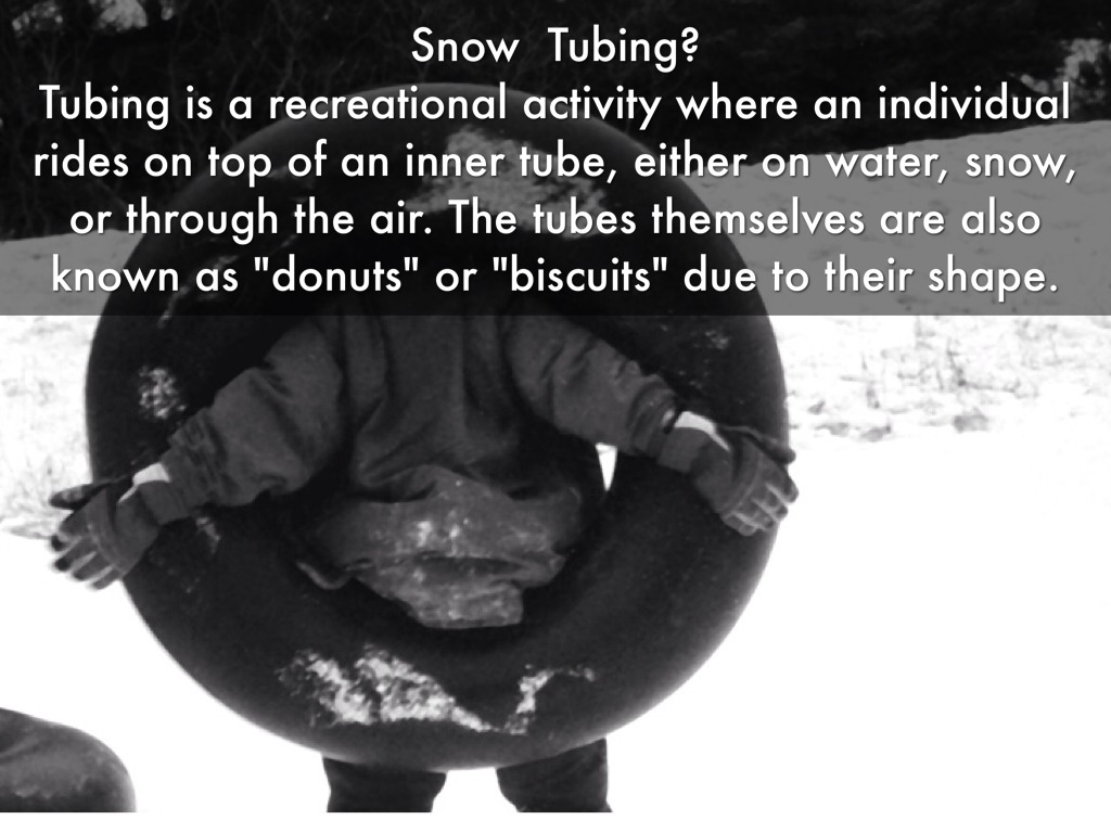 Snow Tubing? Tubing is a recreational activity where an individual rides on top of an inner tube, either on water, snow, or through the air. The tubes themselves are also known as "donuts" or "biscuits" due to their shape.