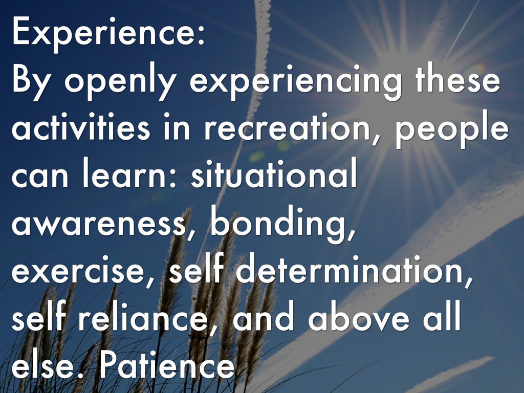 Experience: By openly experiencing these activities in recreation, people can learn: situational awareness, bonding, exercise, self determination, self reliance, and above all else. Patience