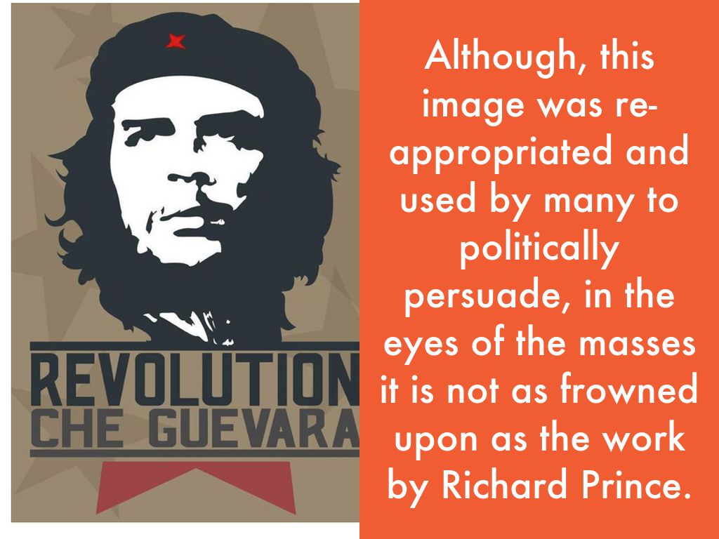 Although, this image was re-appropriated and used by many to politically persuade, in the eyes of the masses it is not as frowned upon as the work by Richard Prince.