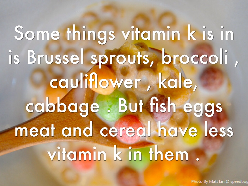 Some things vitamin k is in is Brussel sprouts, broccoli , cauliflower , kale, cabbage . But fish eggs meat and cereal have less vitamin k in them .