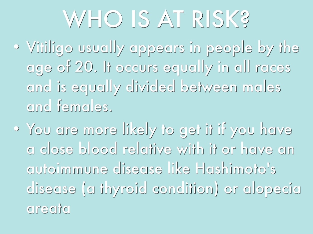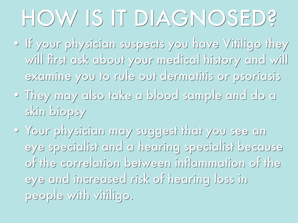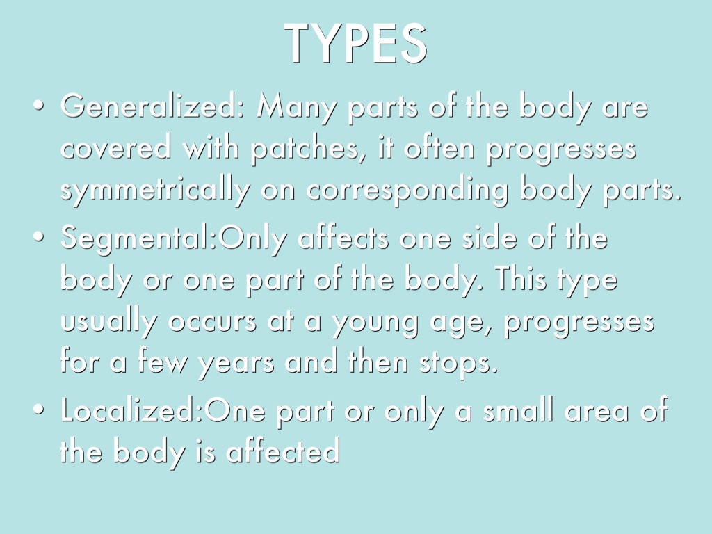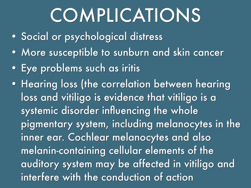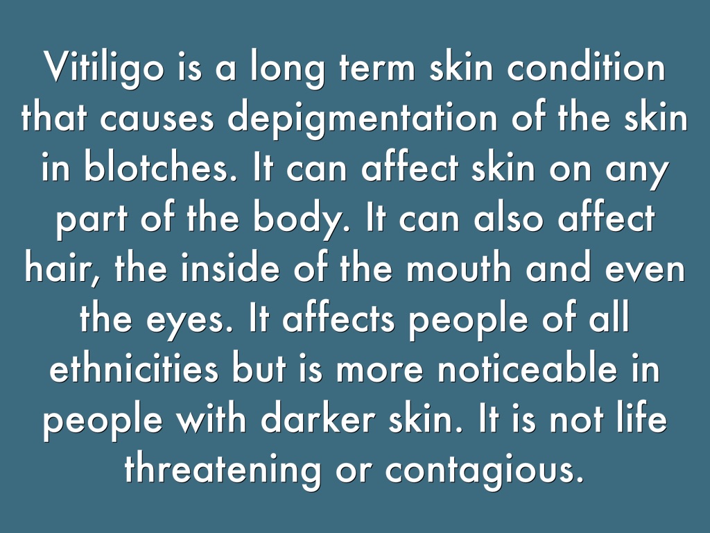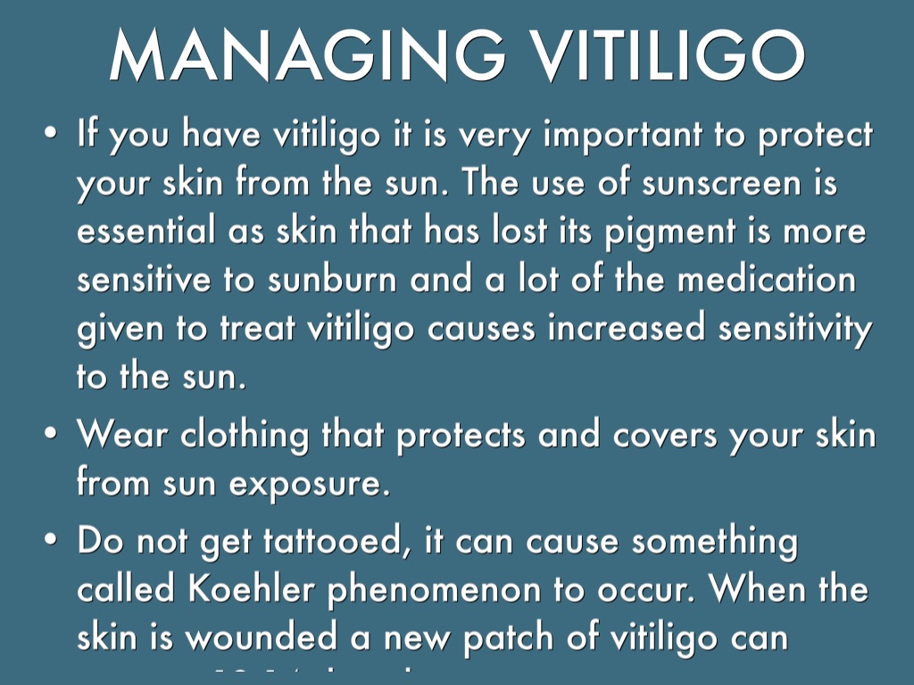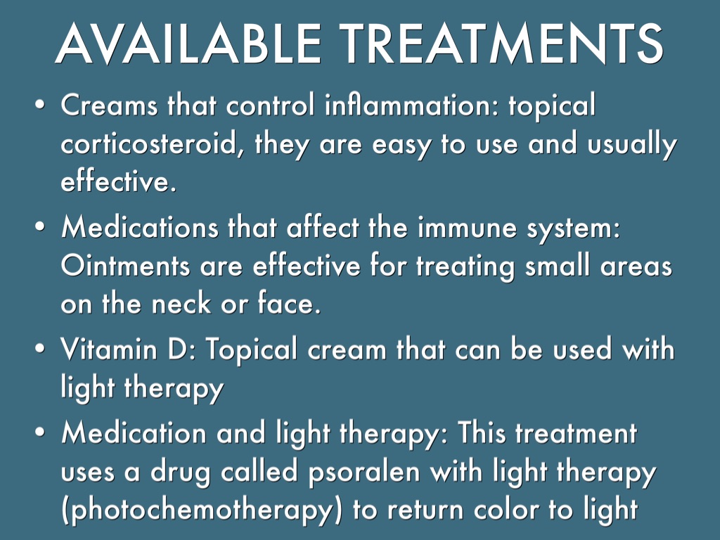 Surgery is also an option if light therapy and medications don't work. Possible treatments include skin grafting (small sections of normal skin are attached to areas that have lost pigment) side effects include infection, scarring, a cobblestone appearance and failure.