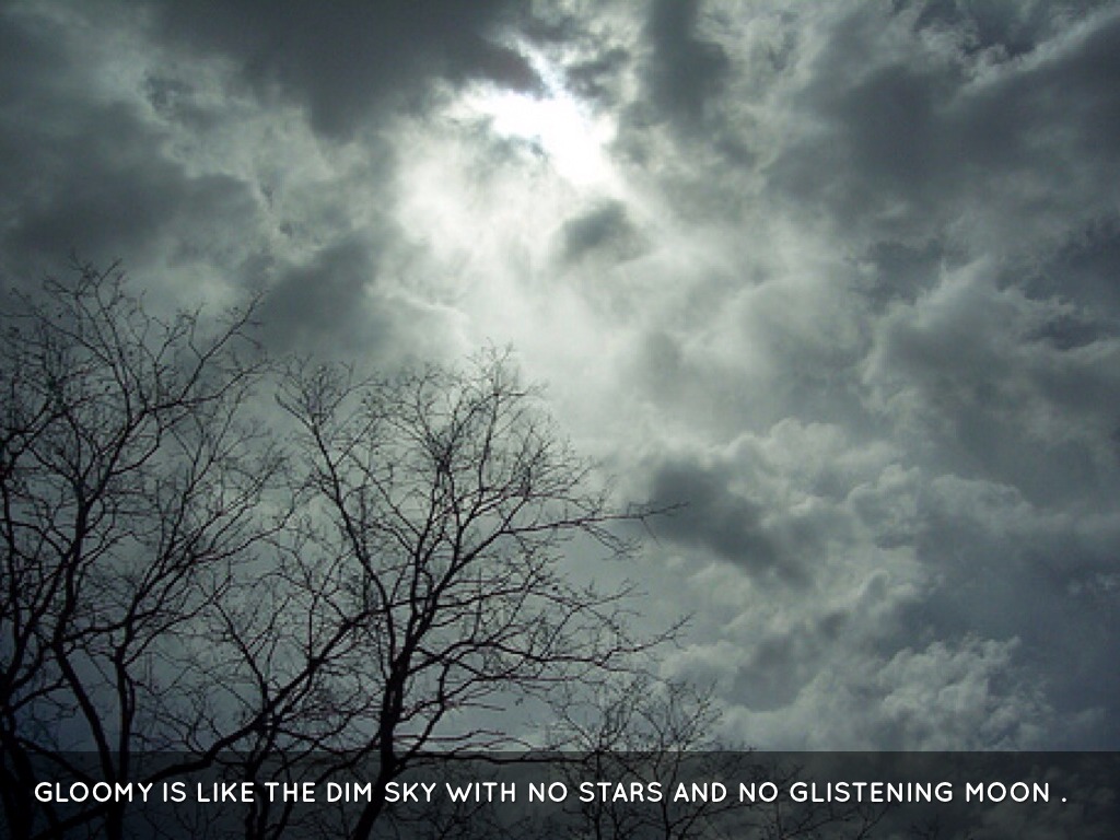 GLOOMY IS LIKE THE DIM SKY WITH NO STARS AND NO GLISTENING MOON .