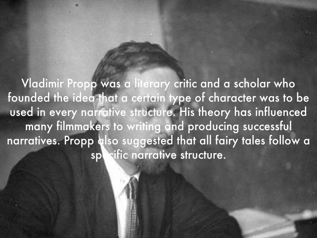 Vladimir Propp was a literary critic and a scholar who founded the idea that a certain type of character was to be used in every narrative structure. His theory has influenced many filmmakers to writing and producing successful narratives. Propp also suggested that all fairy tales follow a specific narrative structure.