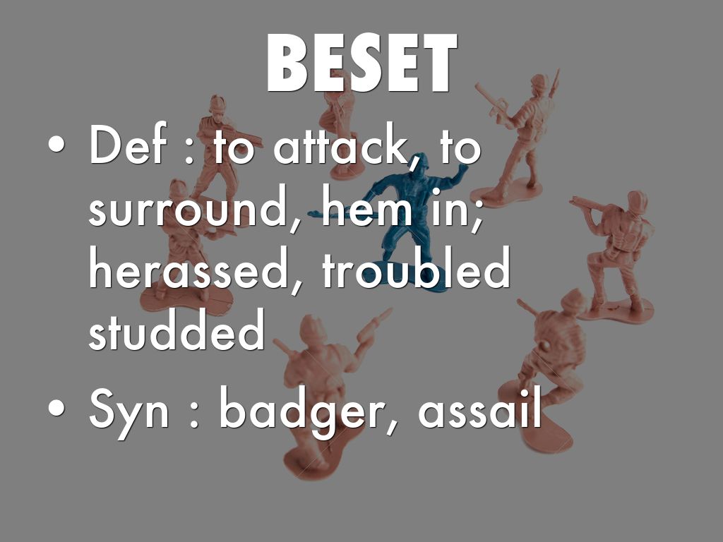 Def : to attack, to surround, hem in; herassed, troubled studded