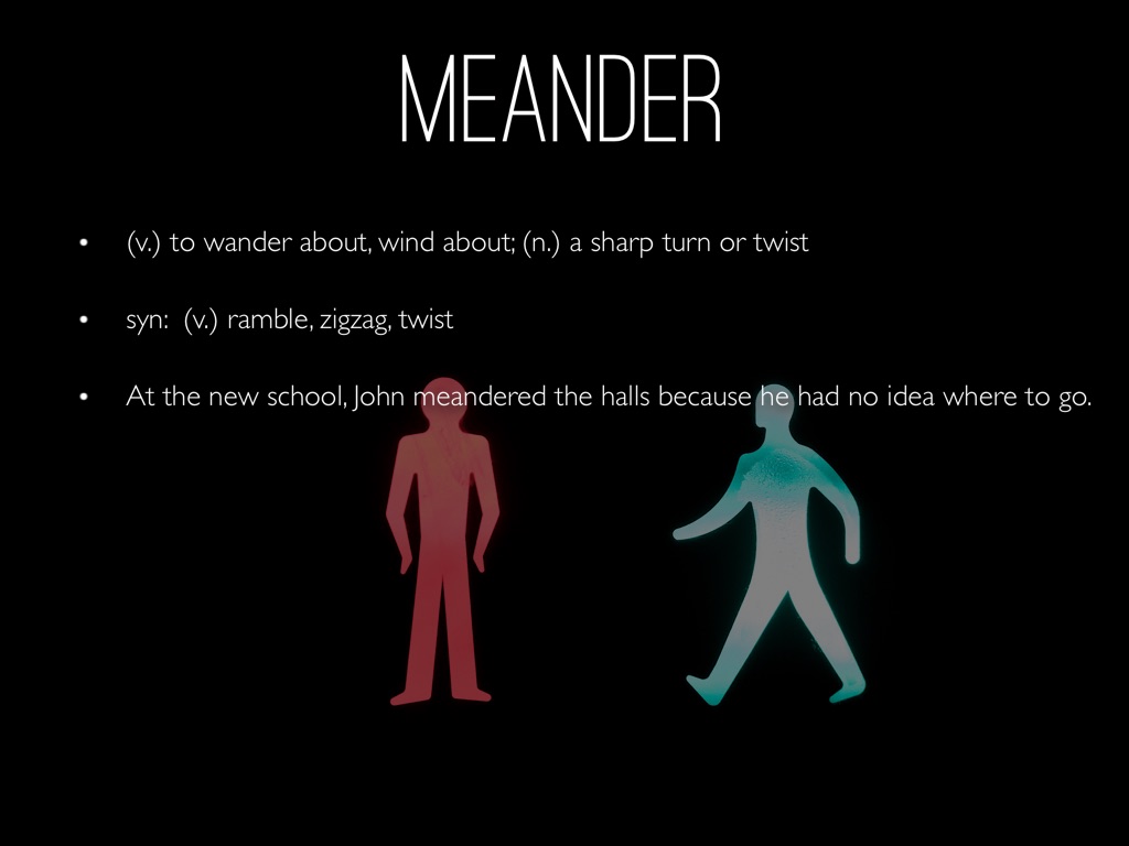 (v.) to wander about, wind about; (n.) a sharp turn or twist