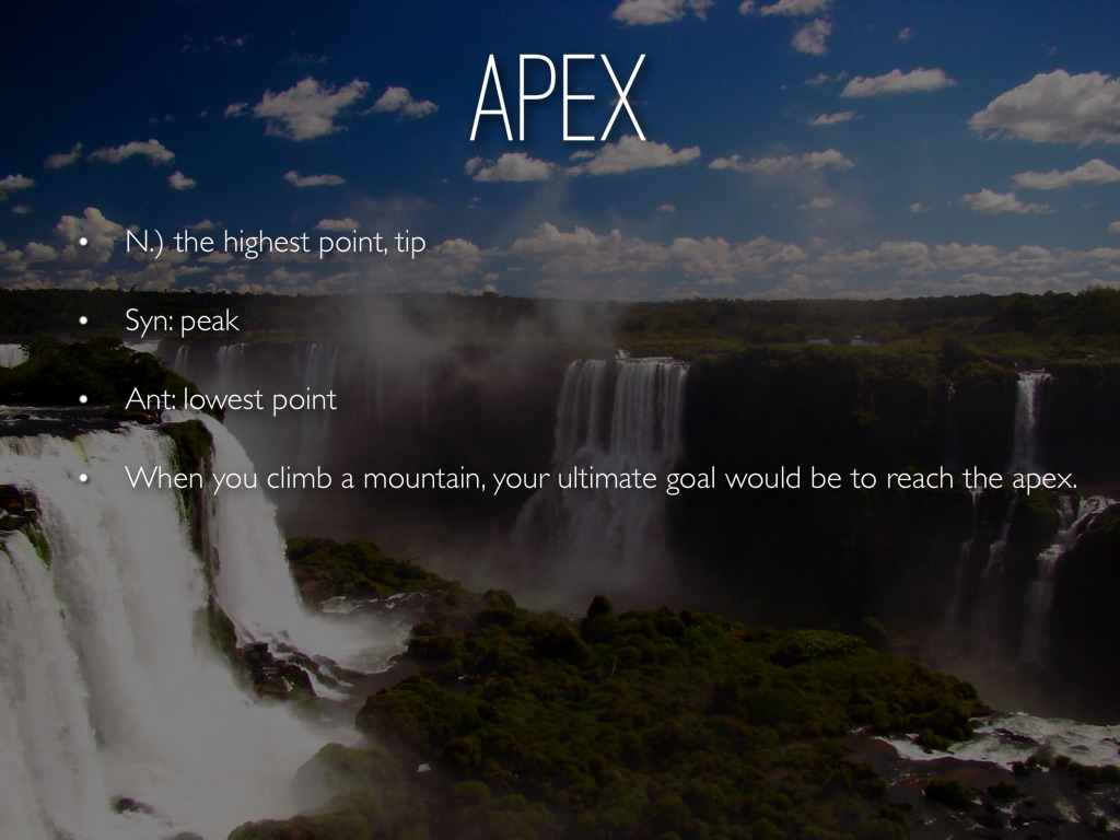 When you climb a mountain, your ultimate goal would be to reach the apex.