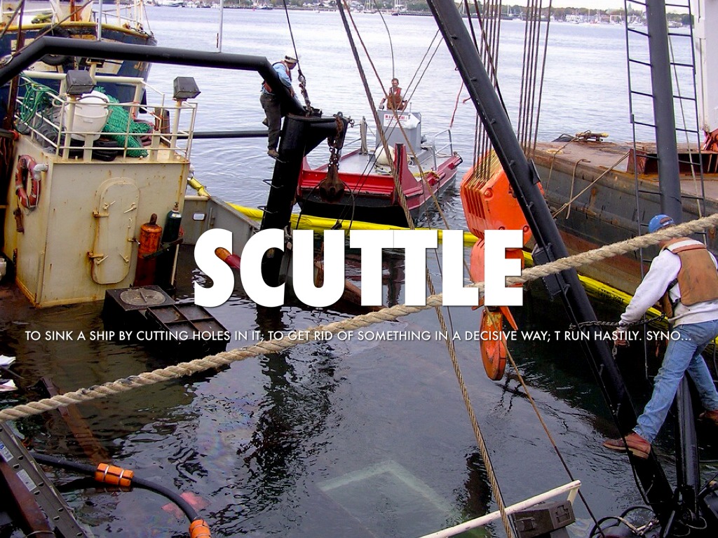 TO SINK A SHIP BY CUTTING HOLES IN IT; TO GET RID OF SOMETHING IN A DECISIVE WAY; T RUN HASTILY. SYNONYMS: ABANDON, DISCARD, SCRAP, DITCH, DUMP. ANTONYMS: KEEP AFLOAT, SALVAGE, RESCUE, PRESERVE