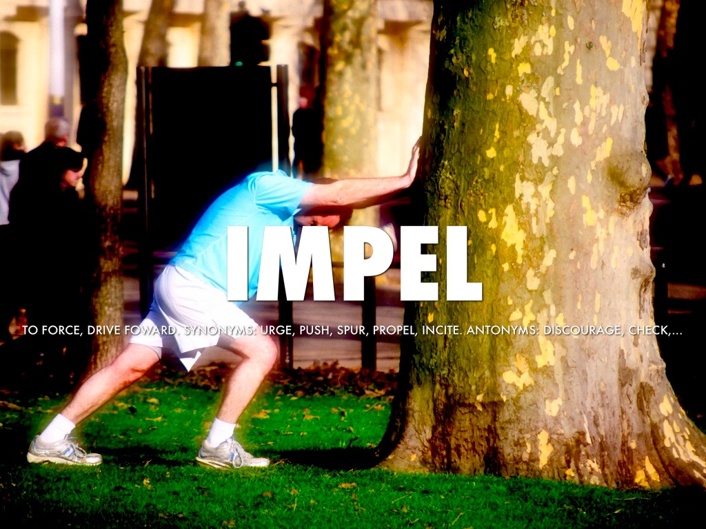 TO FORCE, DRIVE FOWARD. SYNONYMS: URGE, PUSH, SPUR, PROPEL, INCITE. ANTONYMS: DISCOURAGE, CHECK, RESTRAIN, CURB
