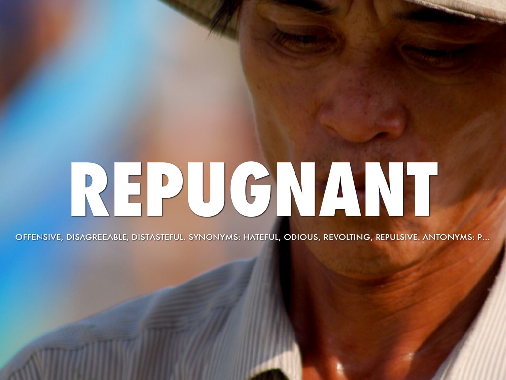 OFFENSIVE, DISAGREEABLE, DISTASTEFUL. SYNONYMS: HATEFUL, ODIOUS, REVOLTING, REPULSIVE. ANTONYMS: PLEASING, ATTRACTIVE, TEMPTING, WHOLESOME