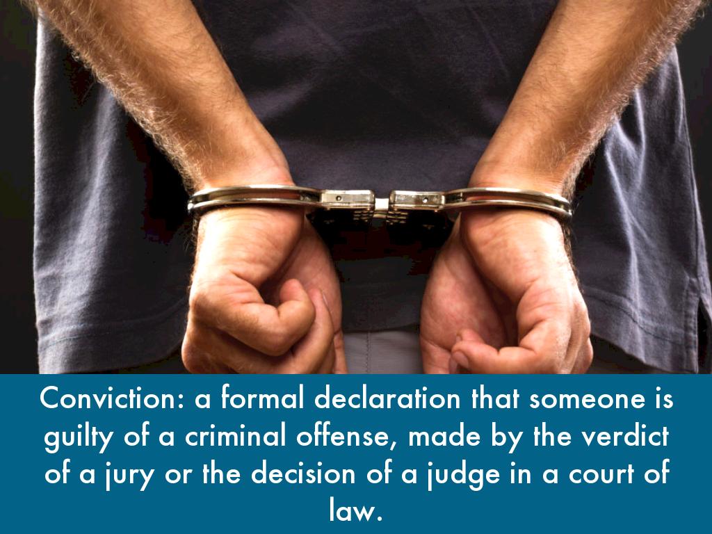 Conviction: a formal declaration that someone is guilty of a criminal offense, made by the verdict of a jury or the decision of a judge in a court of law.