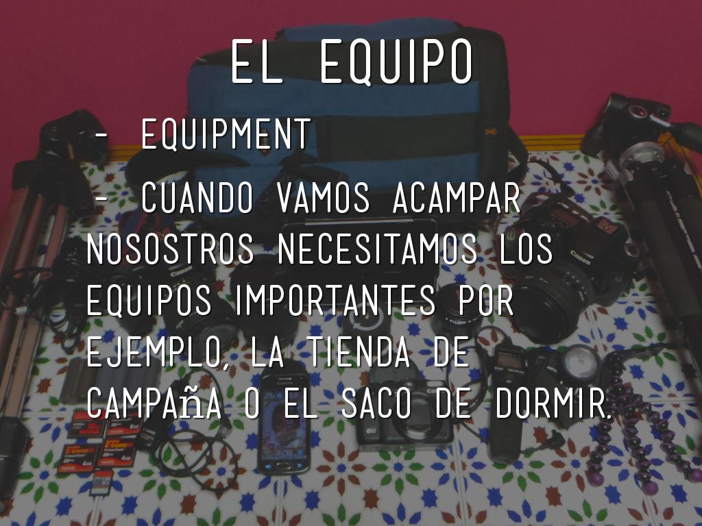 - cuando vamos acampar nosostros necesitamos los equipos importantes por ejemplo, la tienda de campaña o el saco de dormir.