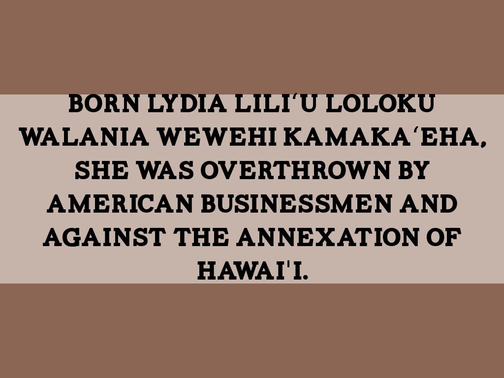 Born Lydia Liliʻu Loloku Walania Wewehi Kamakaʻeha, She Was overthrown by American businessmen and against the annexation of Hawai'i.
