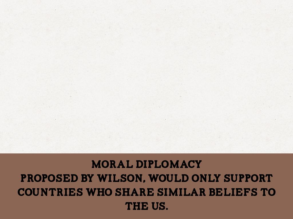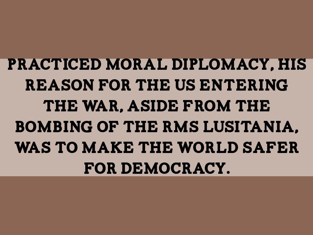 Practiced moral diplomacy, his reason for the US entering the war, aside from the bombing of the RMS Lusitania, was to make the world safer for democracy.