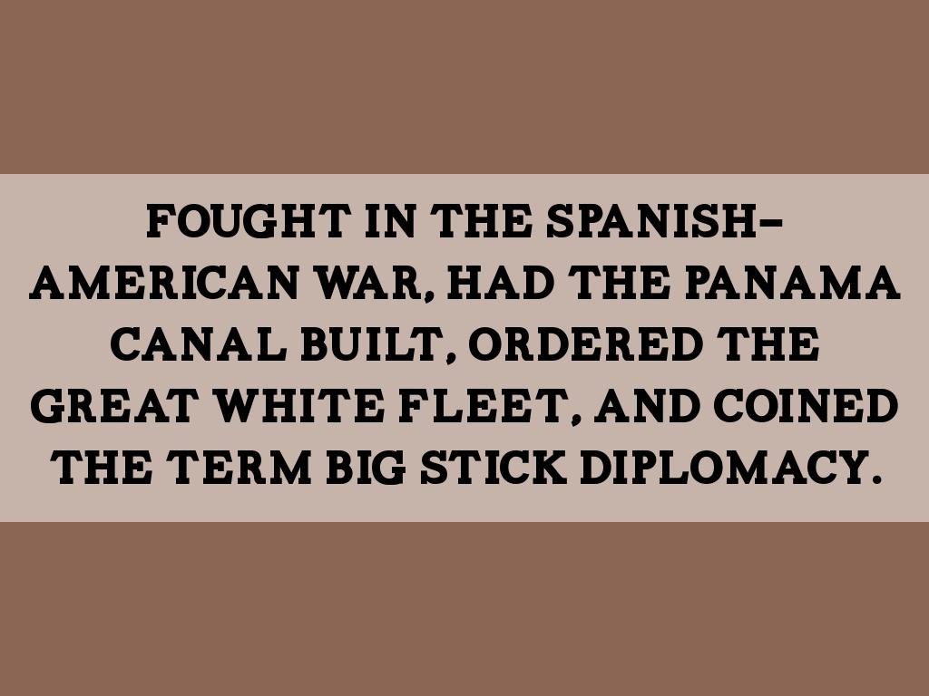Fought in the SPanisH-American war, had the panama Canal built, ordered the great white fleet, and coined the term big stick diplomacy.