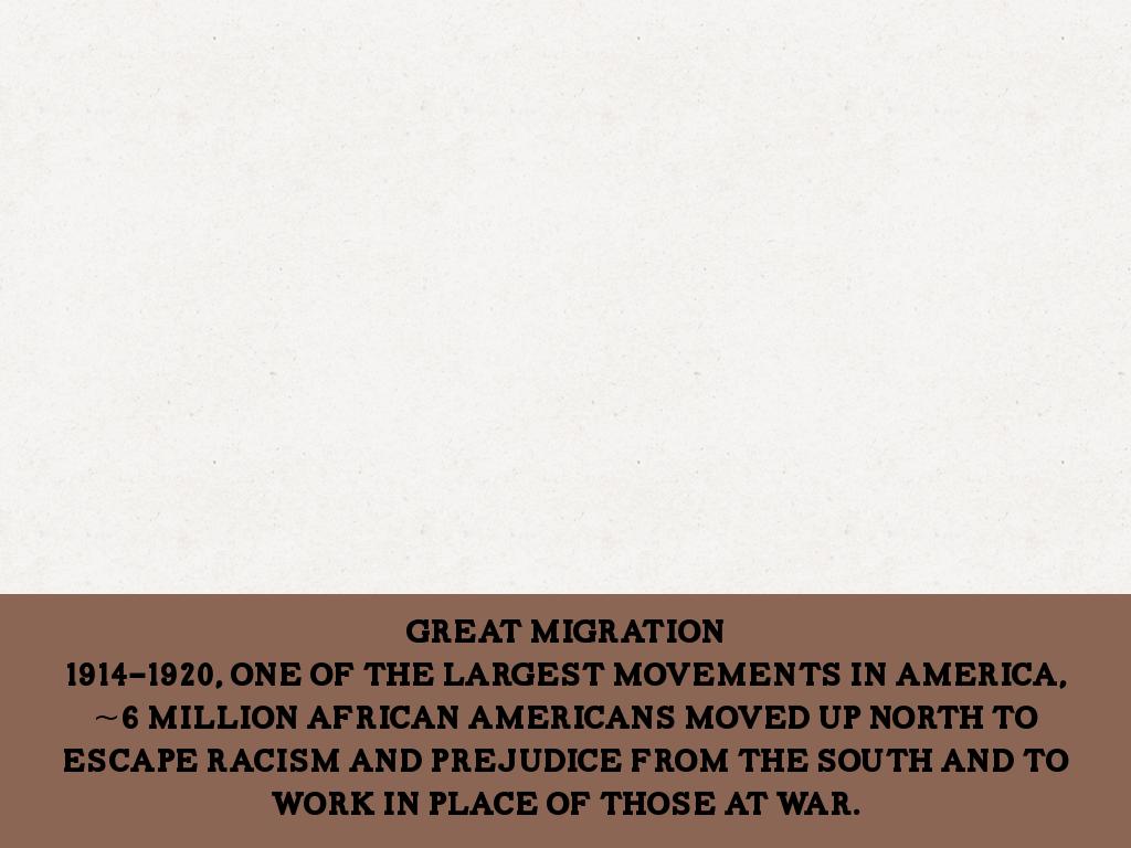 1914-1920, One of the largest movements in America, ~6 million African Americans moved up north to escape racism and prejudice from the SOuth and to work in place of those at war.