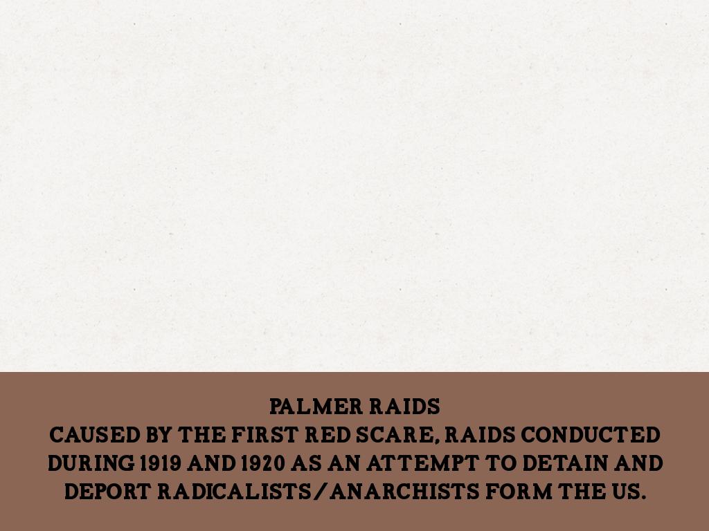 Caused by the First Red SCare, Raids conducted during 1919 and 1920 as an attempt to detain and deport radicalists/anarchists form the US.