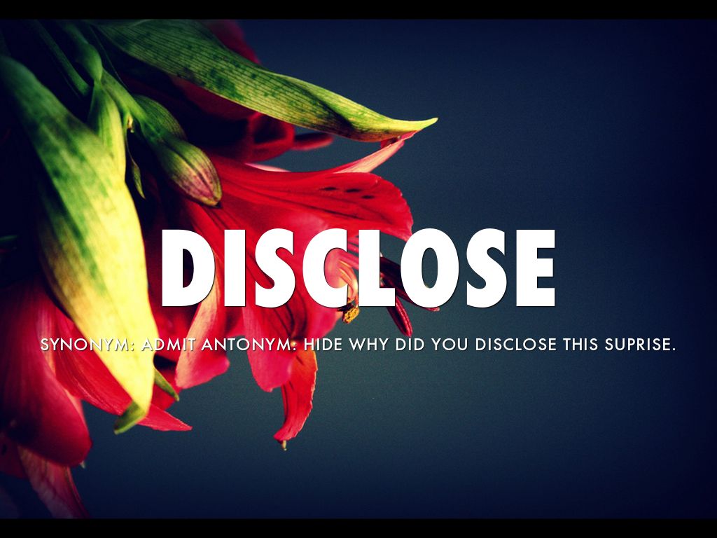 SYNONYM: ADMIT ANTONYM: HIDE WHY DID YOU DISCLOSE THIS SUPRISE.