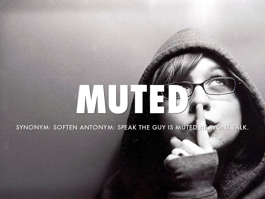 SYNONYM: SOFTEN ANTONYM: SPEAK THE GUY IS MUTED HE WONT TALK.