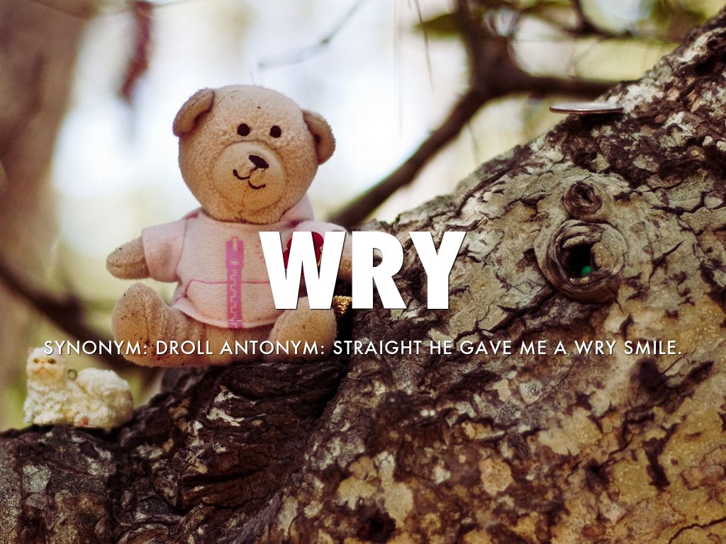 SYNONYM: DROLL ANTONYM: STRAIGHT HE GAVE ME A WRY SMILE.