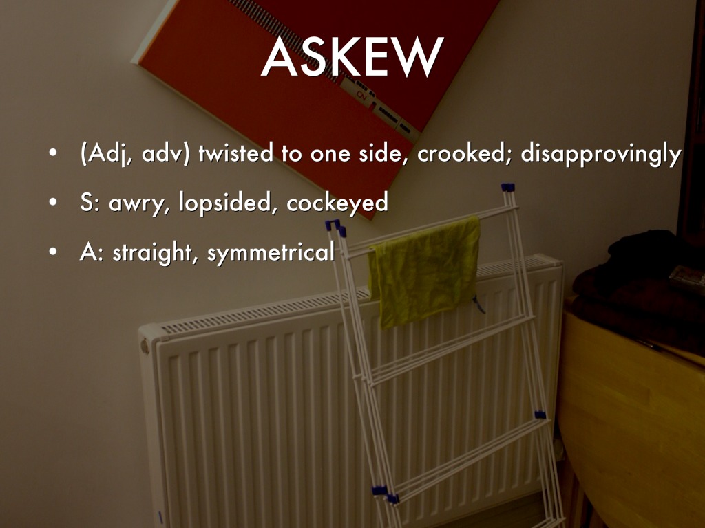 (Adj, adv) twisted to one side, crooked; disapprovingly