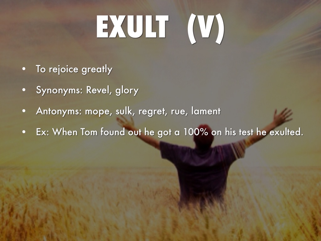 Ex: When Tom found out he got a 100% on his test he exulted.