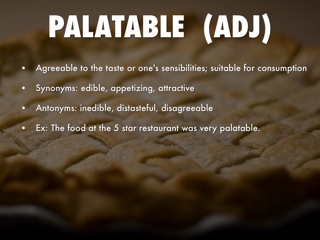 Agreeable to the taste or one's sensibilities; suitable for consumption