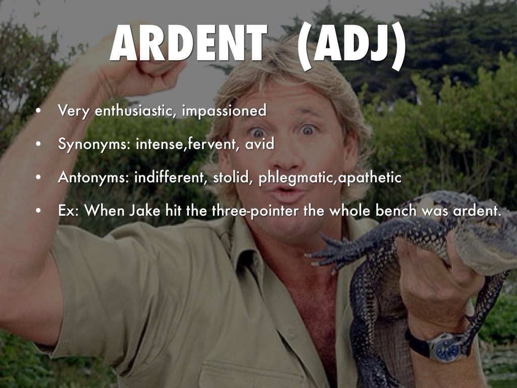Ex: When Jake hit the three-pointer the whole bench was ardent.