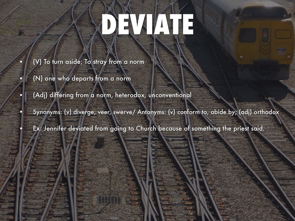 Synonyms: (v) diverge, veer, swerve/ Antonyms: (v) conform to, abide by; (adj) orthodox