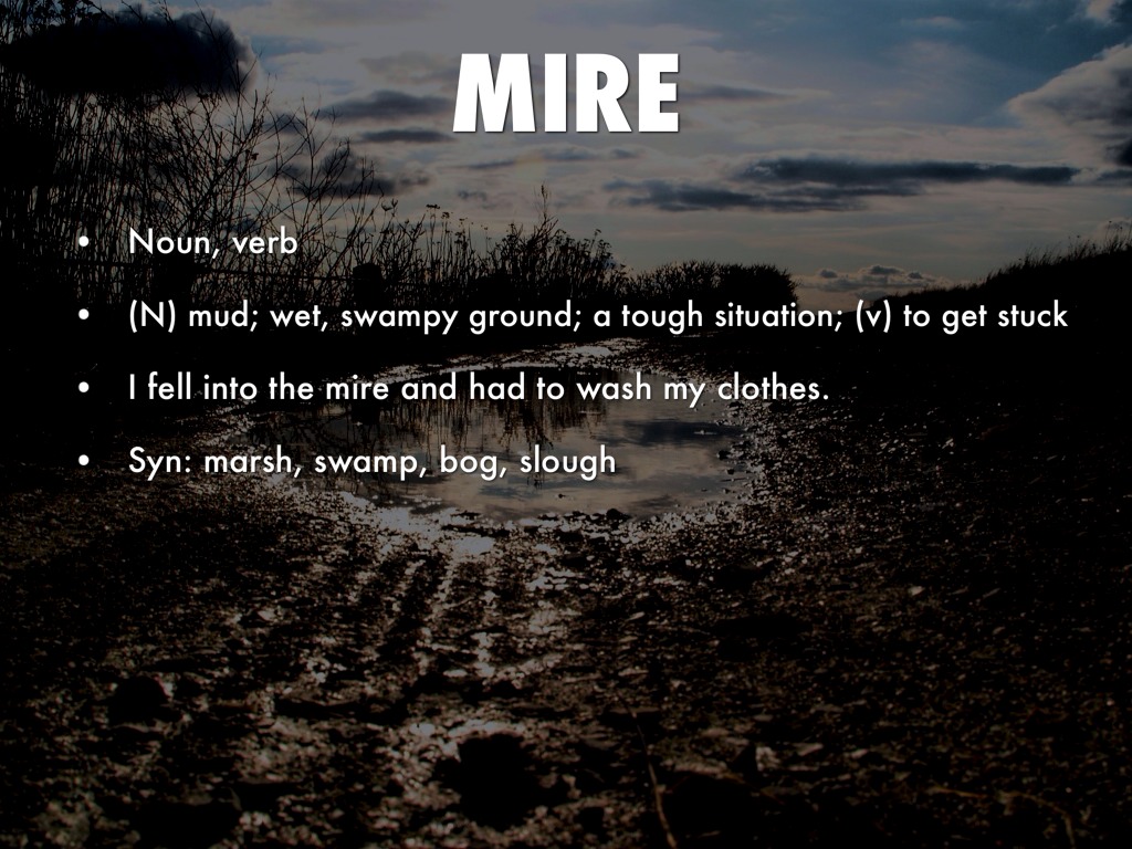 (N) mud; wet, swampy ground; a tough situation; (v) to get stuck