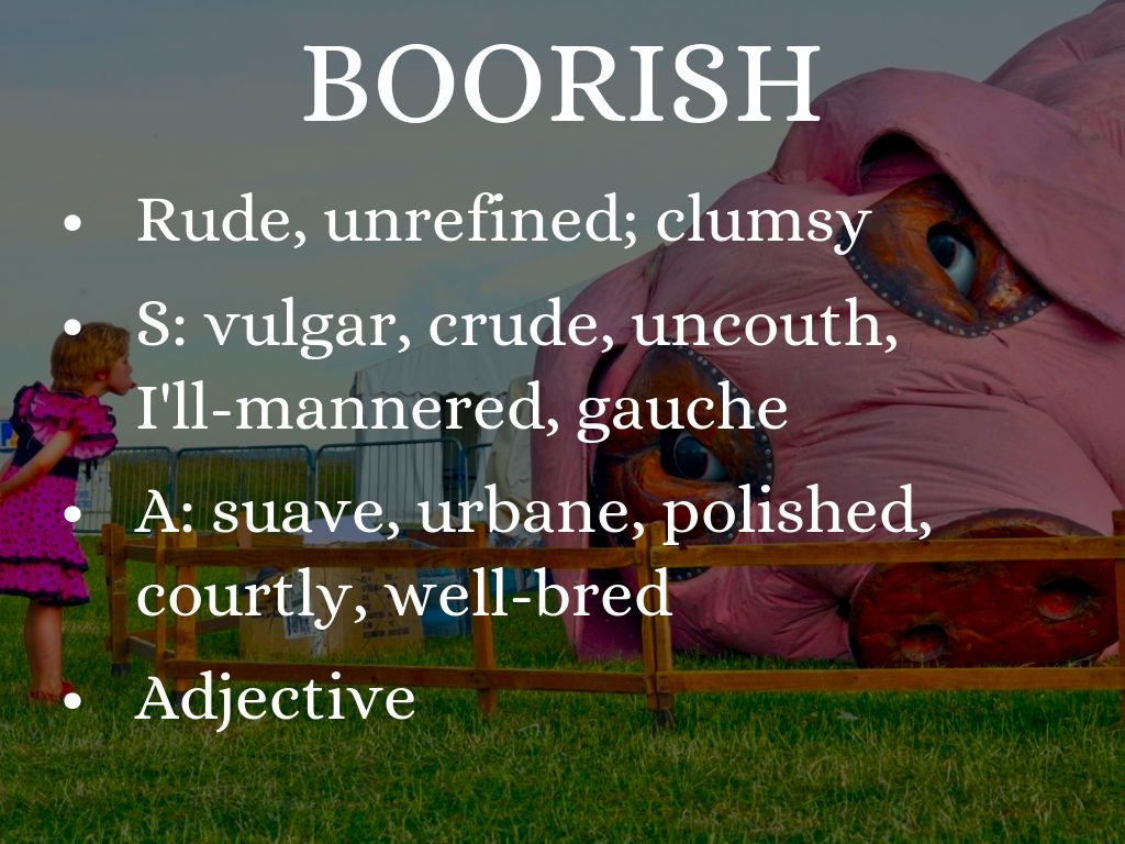 • S: vulgar, crude, uncouth, I'll-mannered, gauche