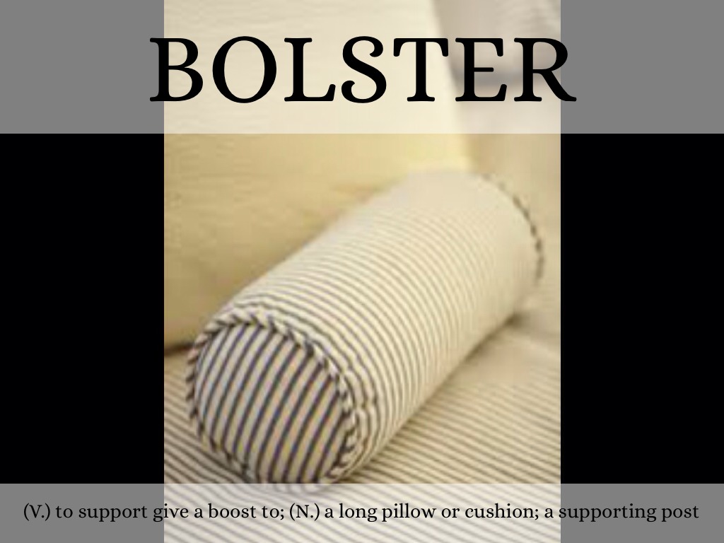 (V.) to support give a boost to; (N.) a long pillow or cushion; a supporting post
