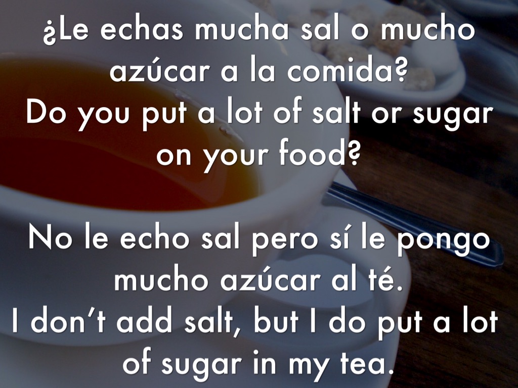 No le echo sal pero sí le pongo mucho azúcar al té.