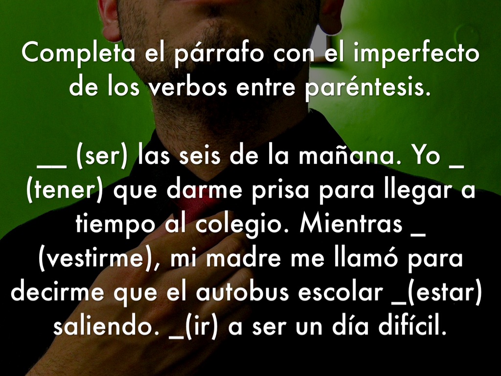 __ (ser) las seis de la mañana. Yo _ (tener) que darme prisa para llegar a tiempo al colegio. Mientras _ (vestirme), mi madre me llamó para decirme que el autobus escolar _(estar) saliendo. _(ir) a ser un día difícil.