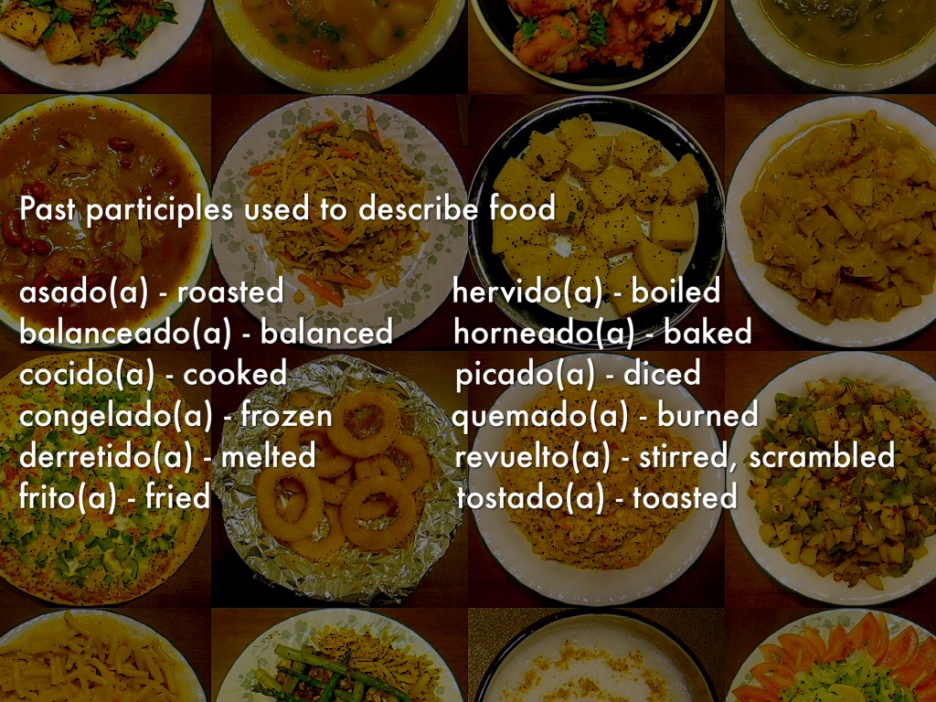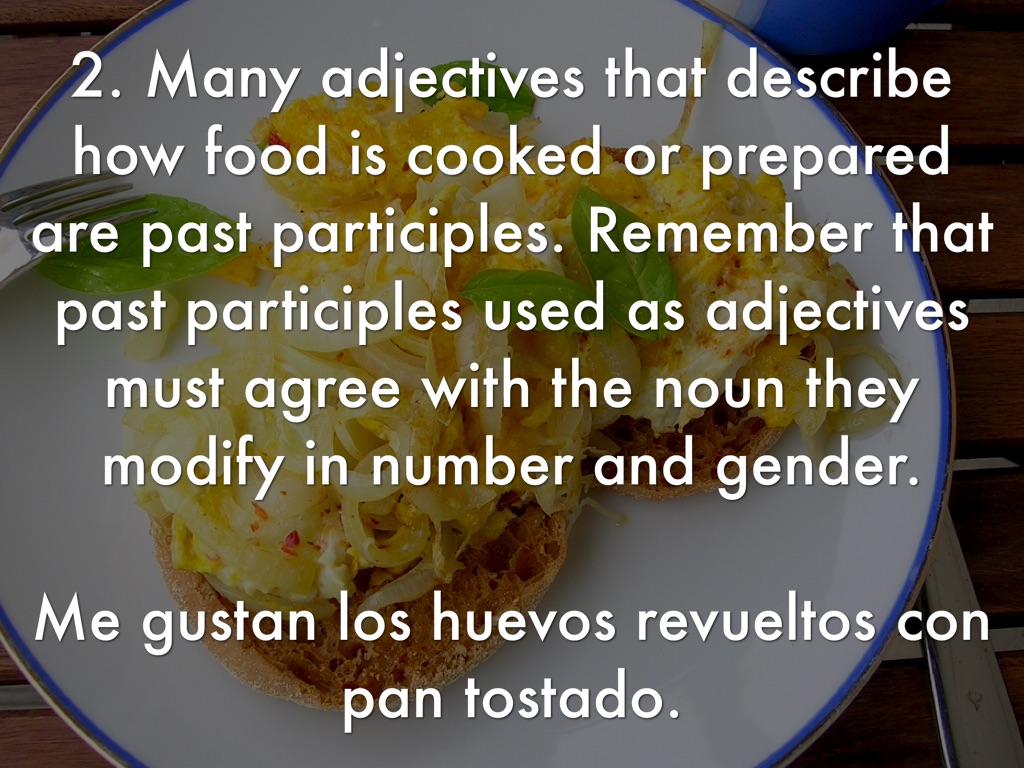 2. Many adjectives that describe how food is cooked or prepared are past participles. Remember that past participles used as adjectives must agree with the noun they modify in number and gender.