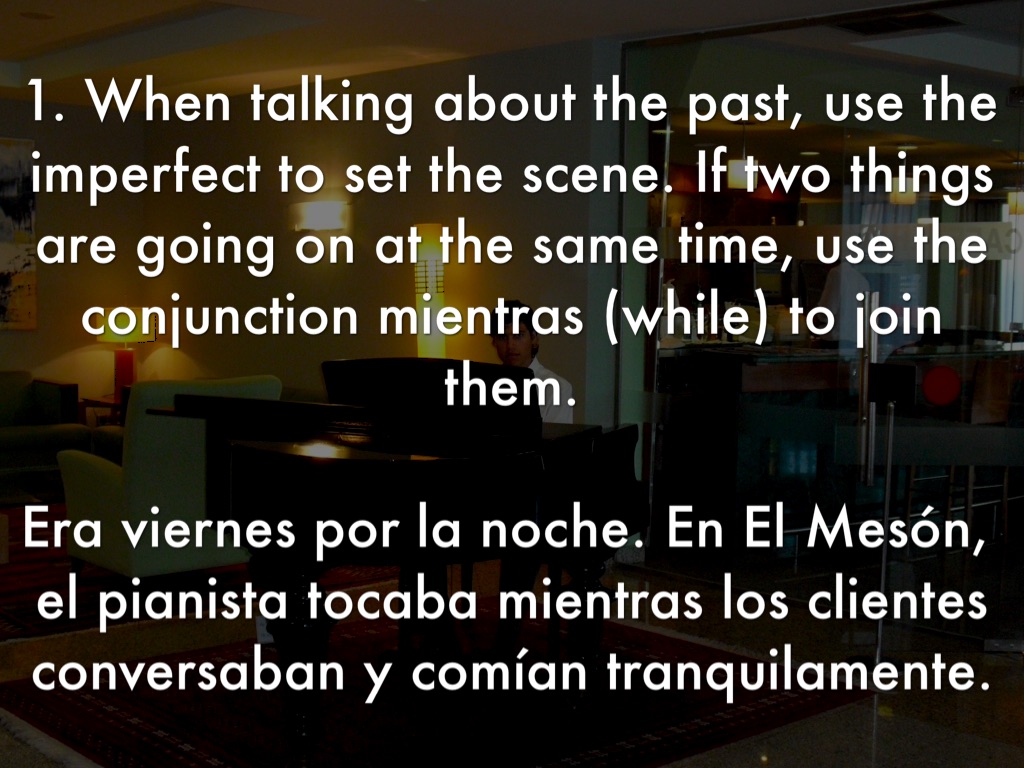 1. When talking about the past, use the imperfect to set the scene. If two things are going on at the same time, use the conjunction mientras (while) to join them.