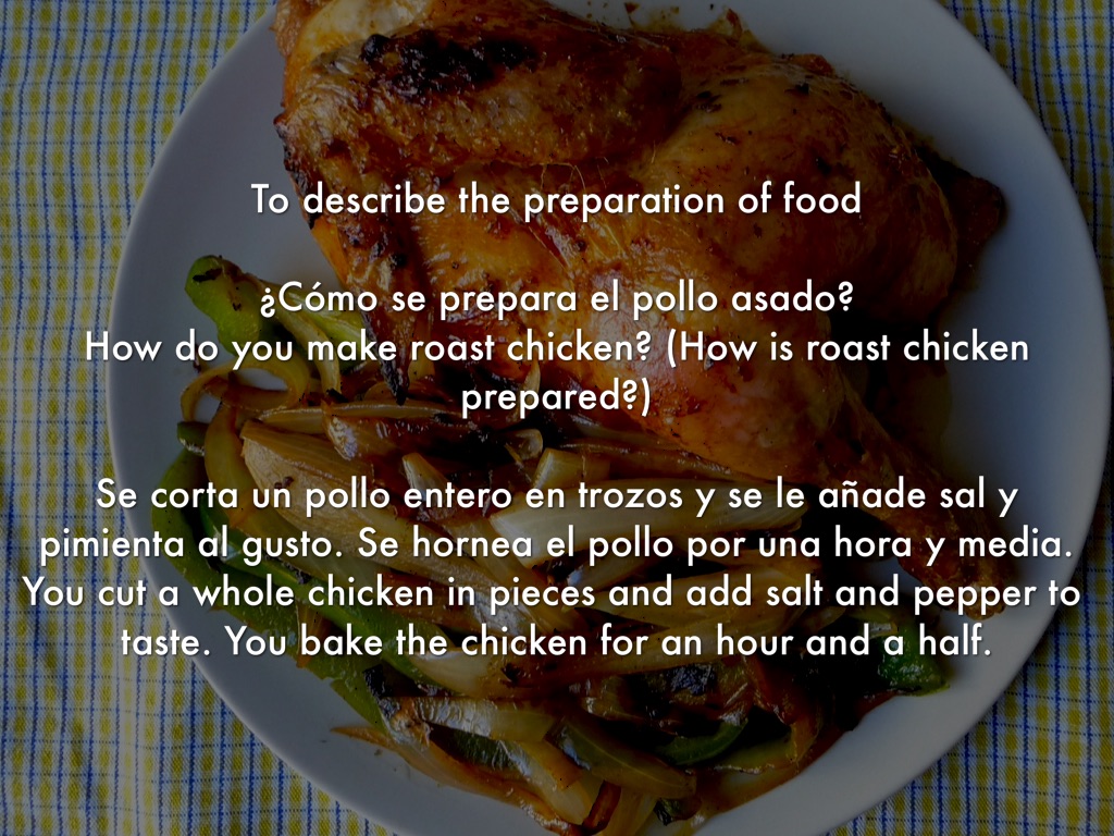 Se corta un pollo entero en trozos y se le añade sal y pimienta al gusto. Se hornea el pollo por una hora y media.
