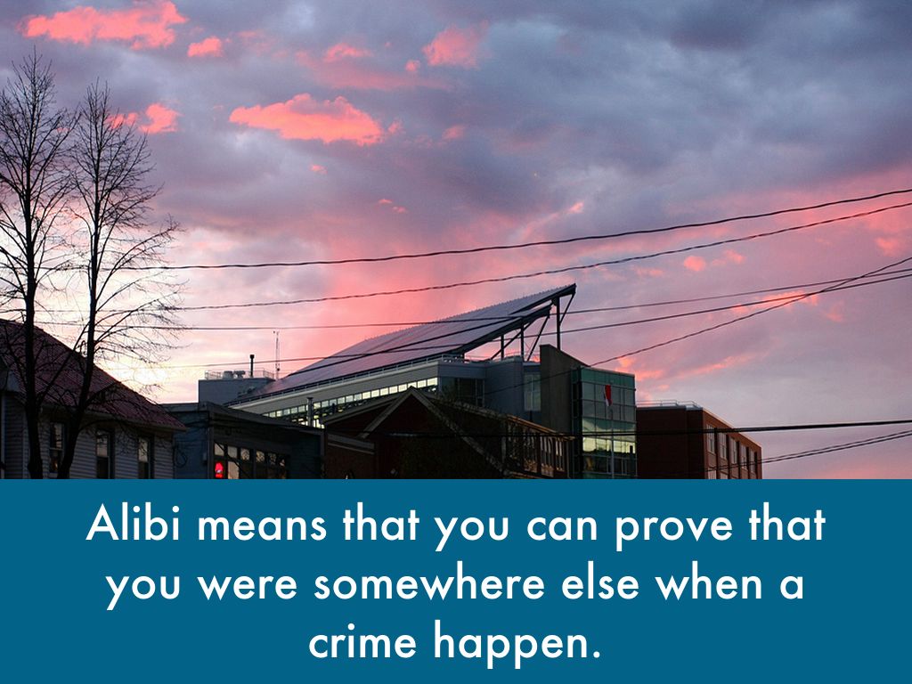 Alibi means that you can prove that you were somewhere else when a crime happen.