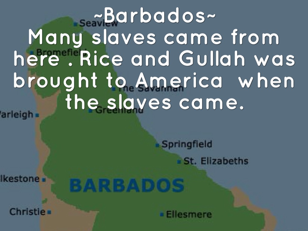 Many slaves came from here . Rice and Gullah was brought to America when the slaves came.