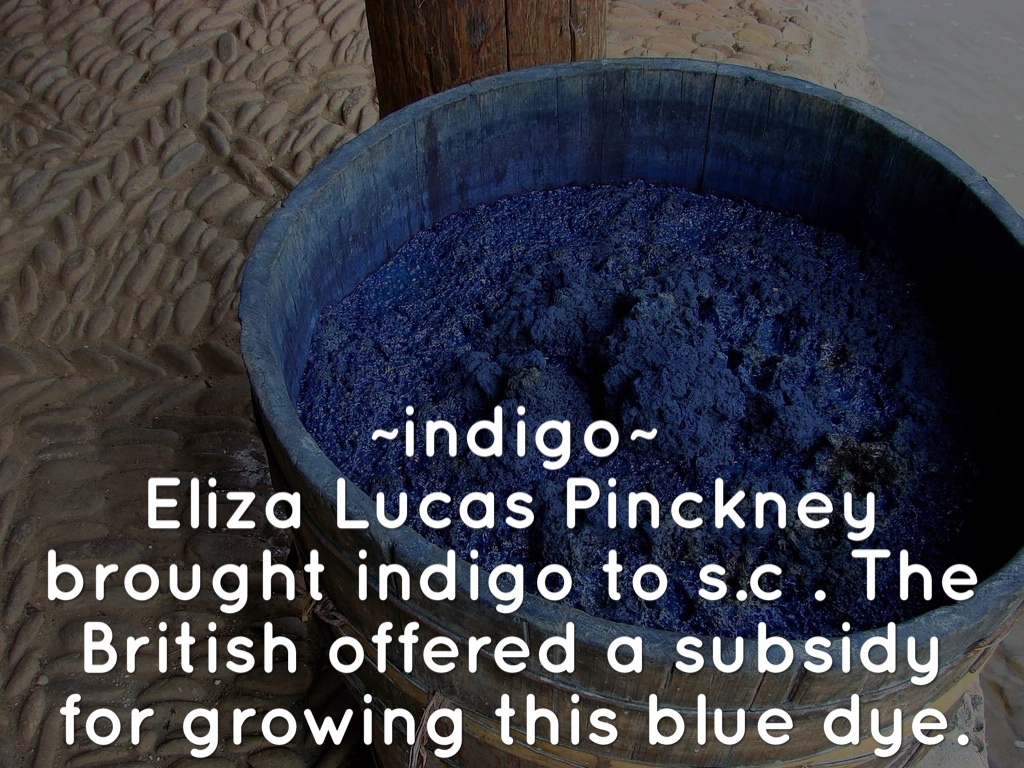 Eliza Lucas Pinckney brought indigo to s.c . The British offered a subsidy for growing this blue dye.