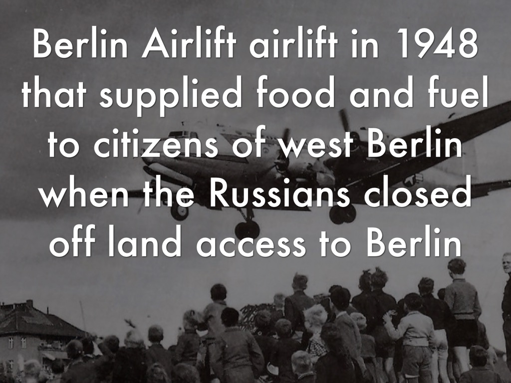 Berlin Airlift airlift in 1948 that supplied food and fuel to citizens of west Berlin when the Russians closed off land access to Berlin