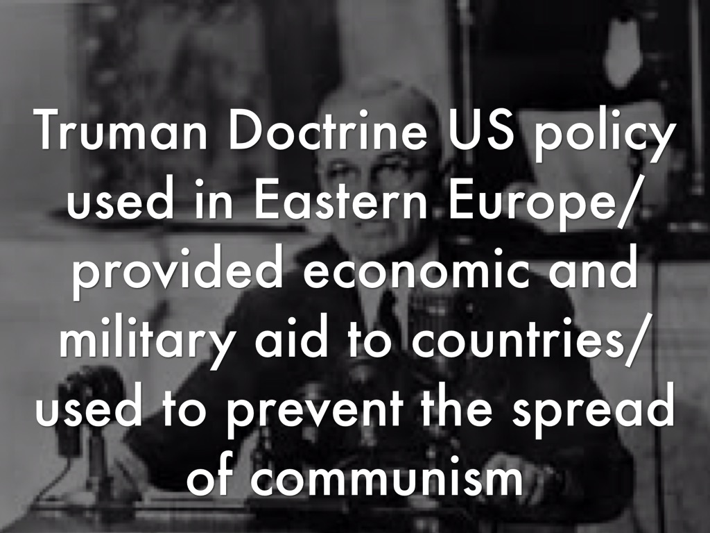 Truman Doctrine US policy used in Eastern Europe/ provided economic and military aid to countries/ used to prevent the spread of communism