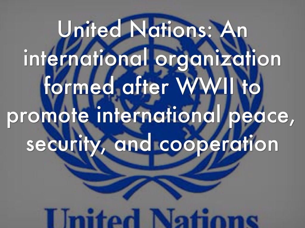 United Nations: An international organization formed after WWII to promote international peace, security, and cooperation