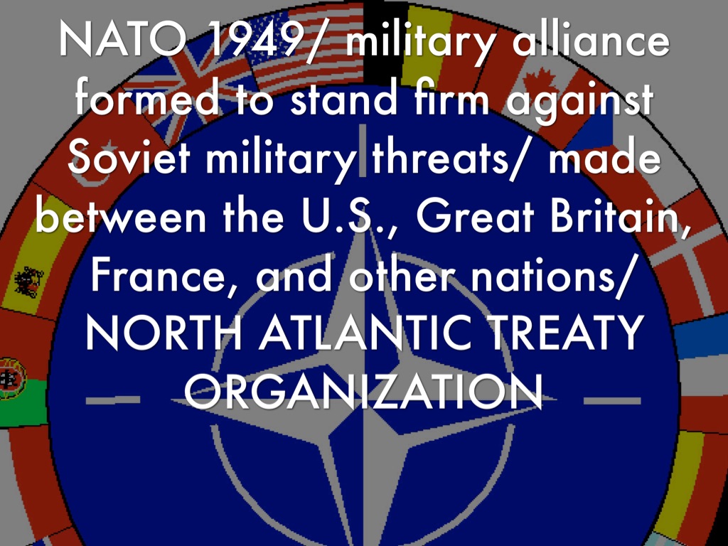 NATO 1949/ military alliance formed to stand firm against Soviet military threats/ made between the U.S., Great Britain, France, and other nations/ NORTH ATLANTIC TREATY ORGANIZATION